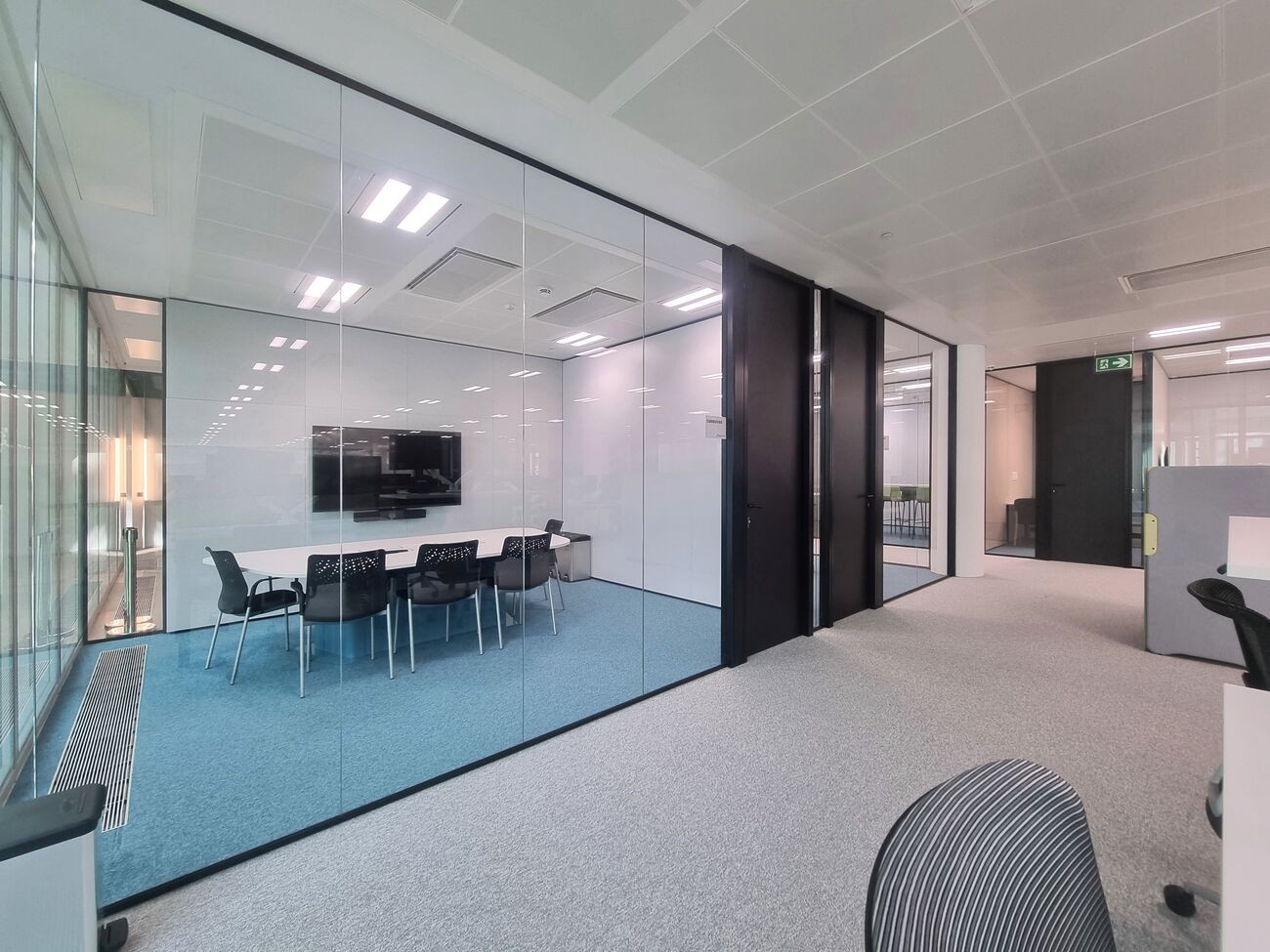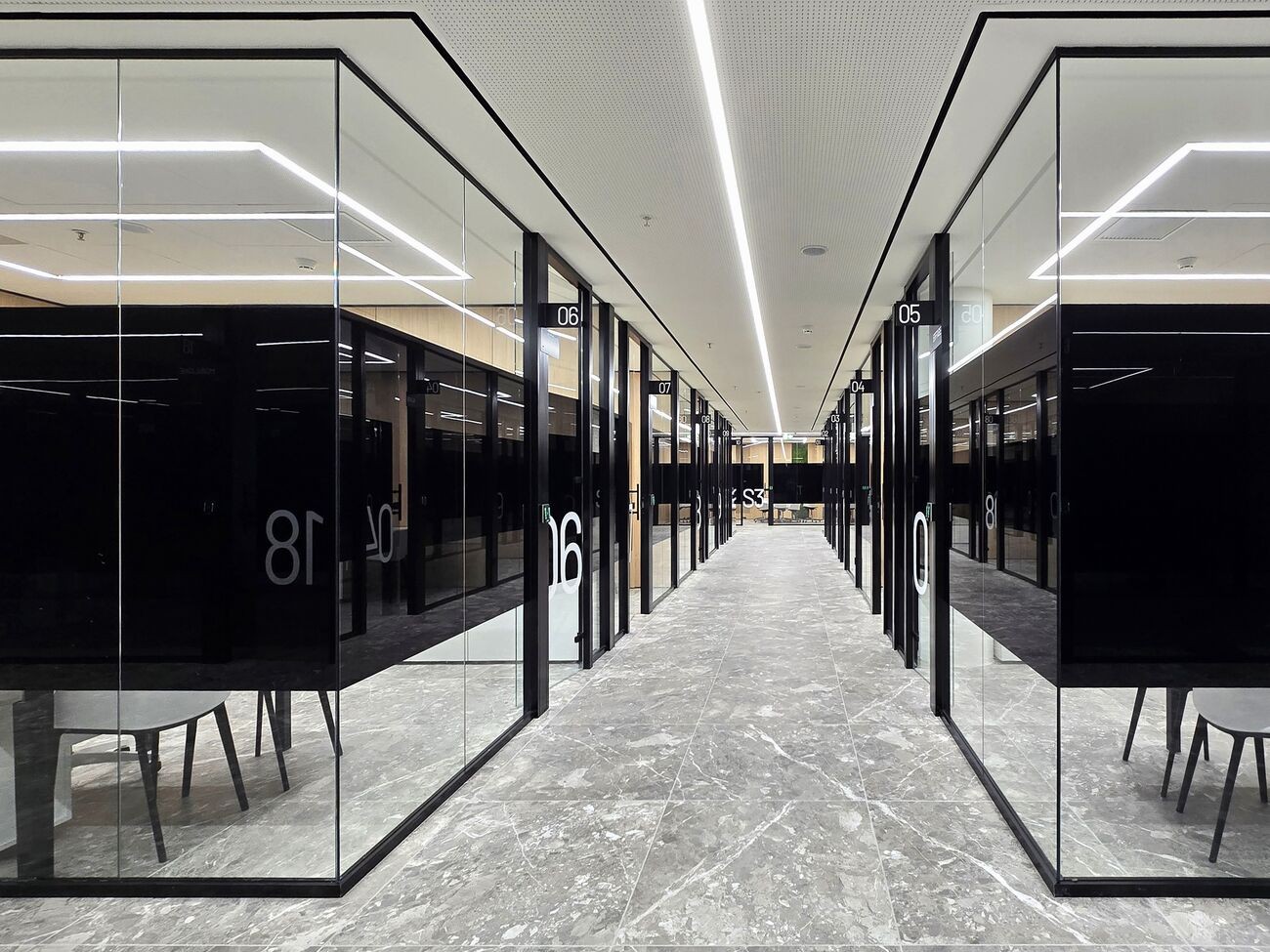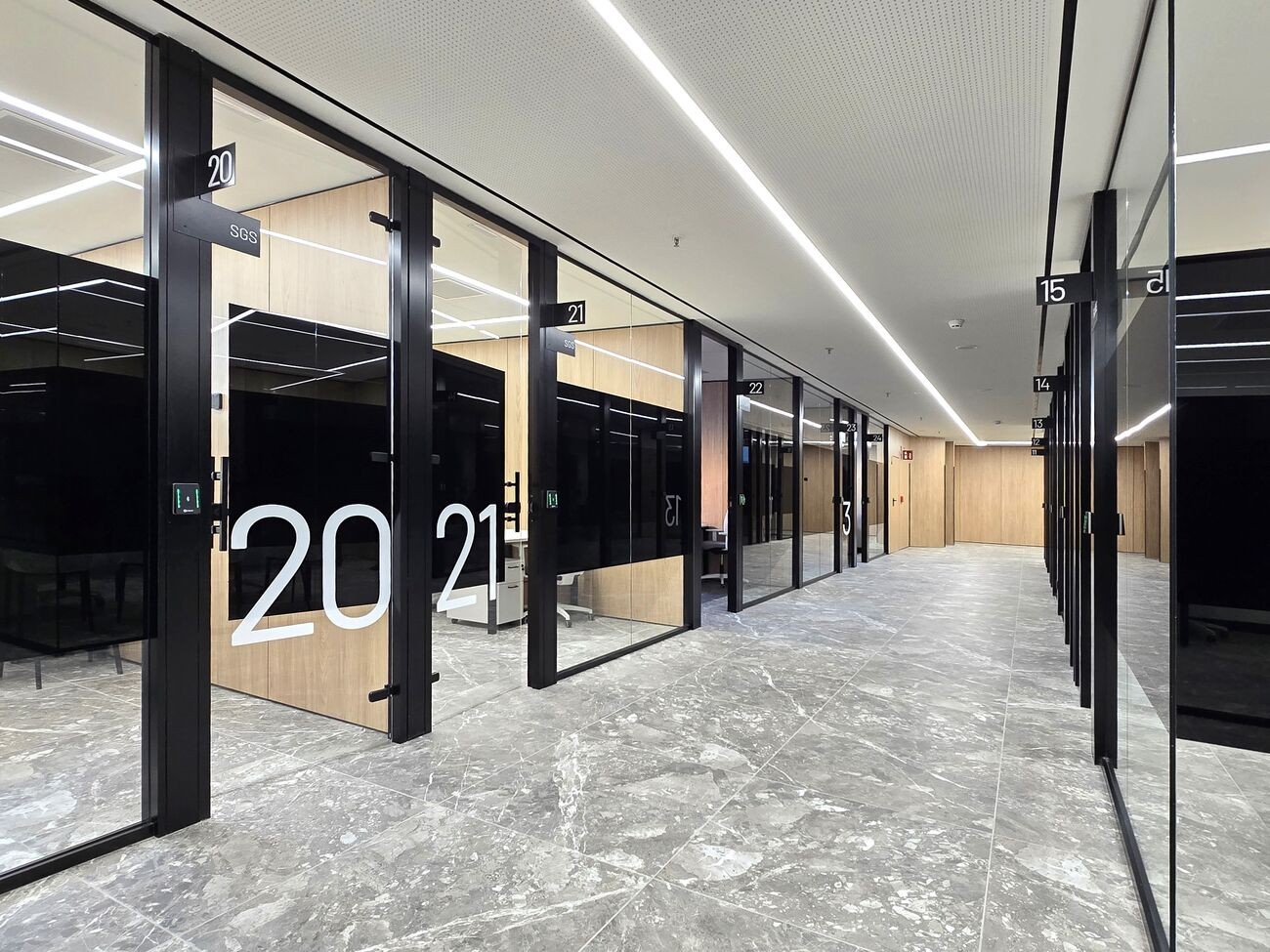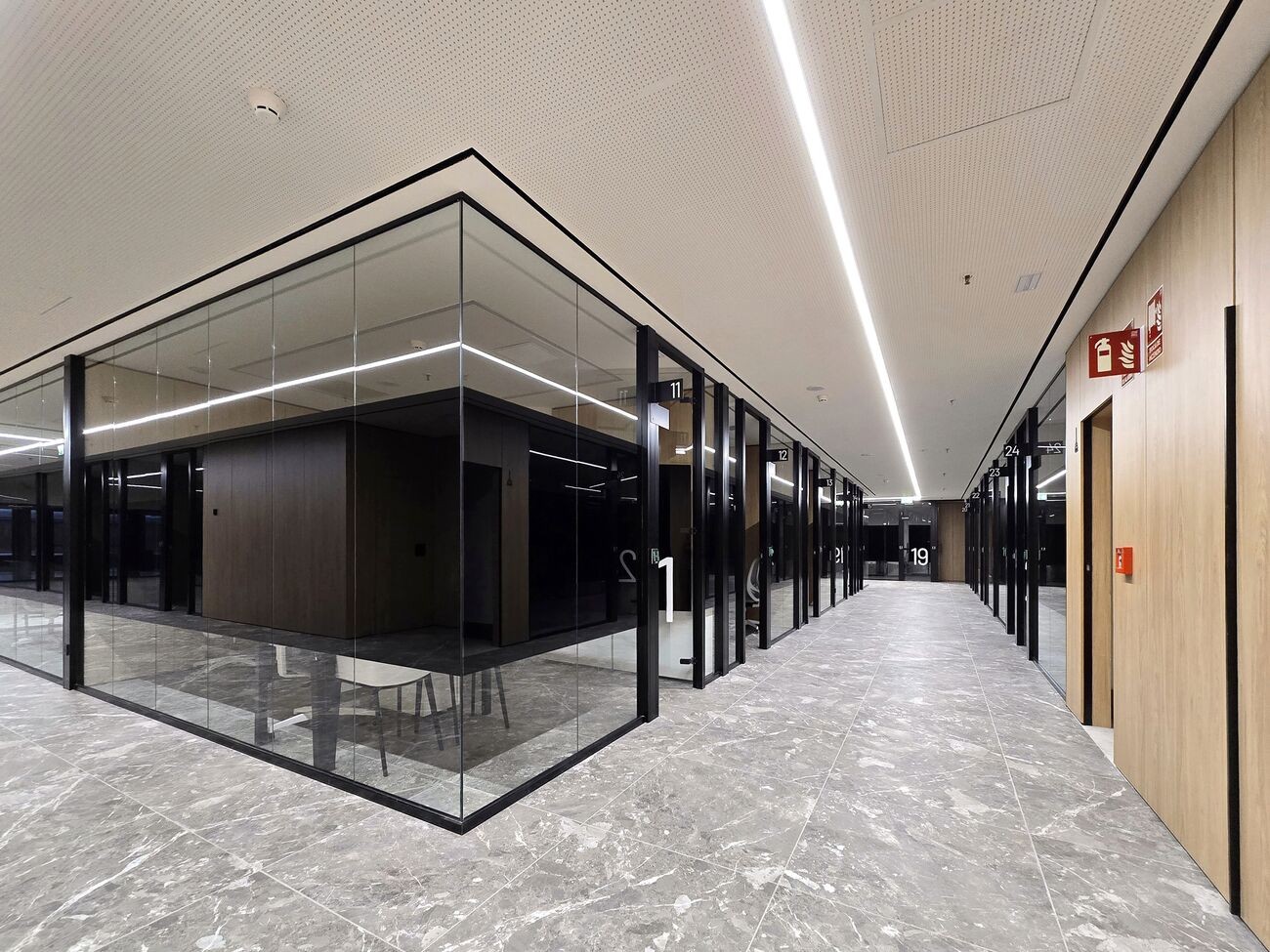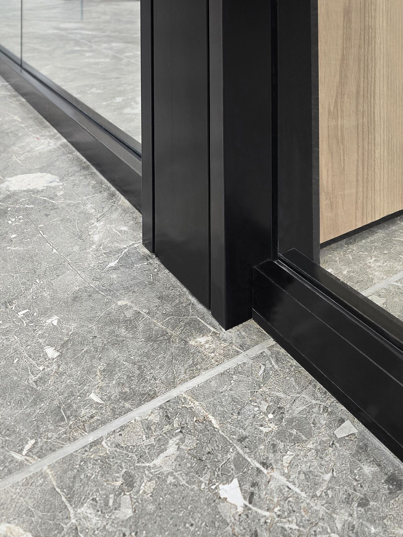 Serie para compartimentación con mamparas en las que se reduce la dimensión de los perfiles a 25 mm surgiendo el vidrio como elemento a exención del sistema sin afectar al comportamiento final de los tabiques.