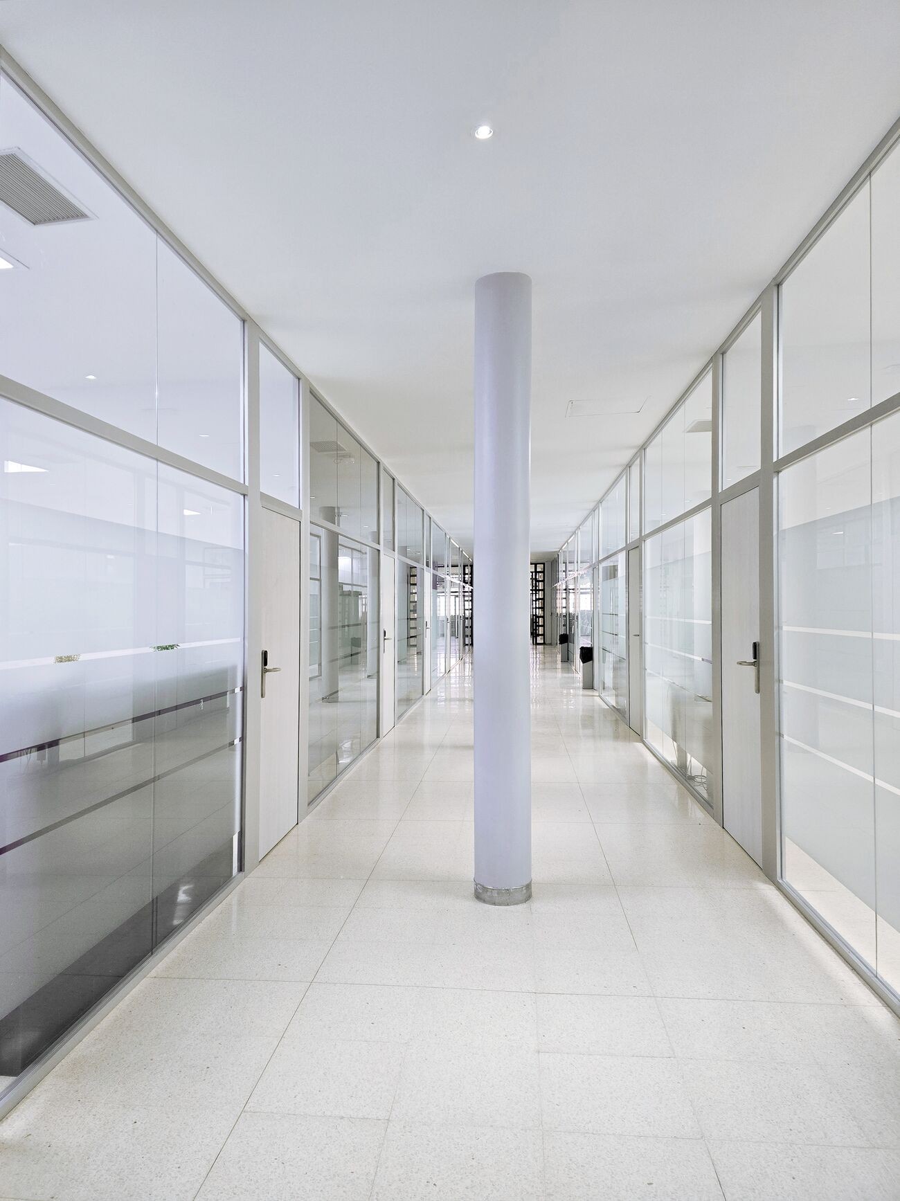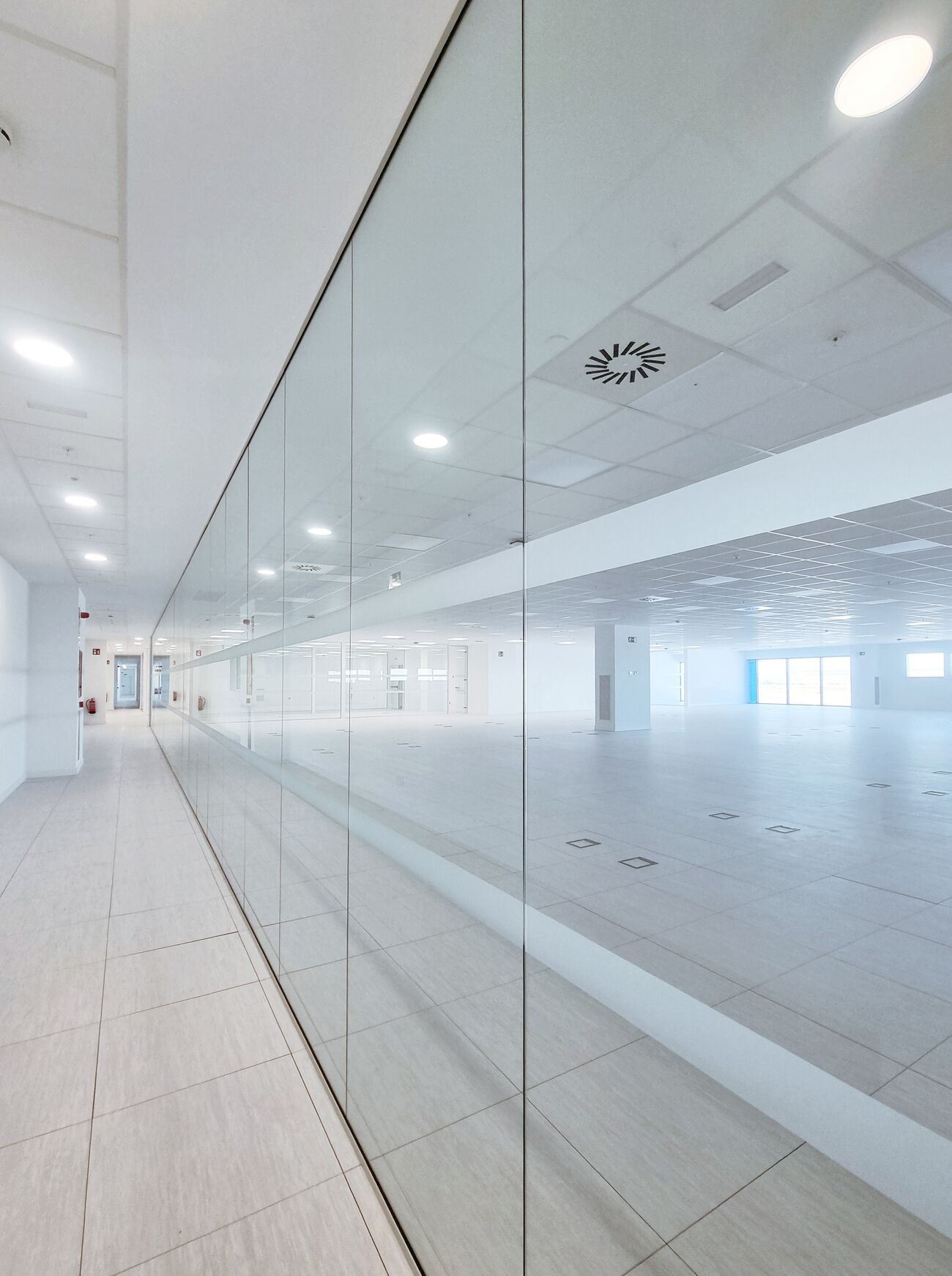 Al tratarse de un solo elemento de división, es conveniente trabajar con vidrios laminares que ofrecen además de su solidez, la ventaja de personalización del butiral intermedio de unión. El pulido de los vivos para su unión a testa entre las diferentes lunas o perfiles, aportan los detalles finales al acabado.