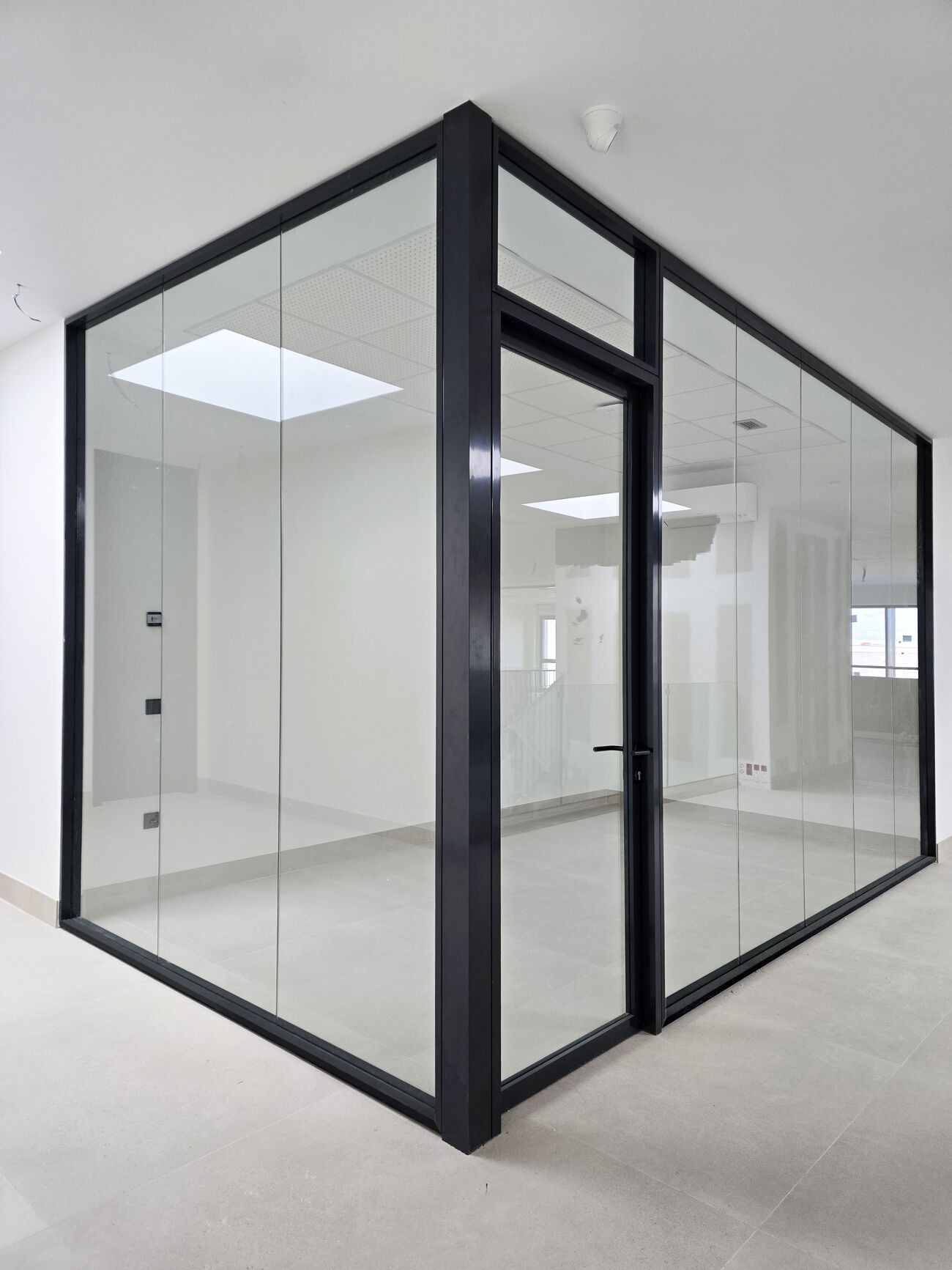 Mampara en doble laminar dotada de perfiles de escaso calado, dejando el doble vidrio flotante con pieza telescópica inferior para absorber desniveles de 20 mm sin variar su composición y comportamiento, predominando el vidrio sobre el propio sistema.